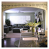The large kitchen wall was painted with wide tone on tone stripes. Above the arch a blessing was scripted complimented by bay leaves. |