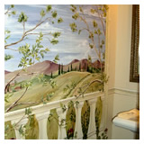 An Italian countryside mural was painted on the guest bathroom wall. The artist created the feeling that you are overlooking the railing out into the countryside. |