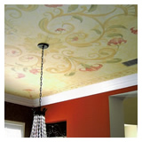 A stunning hand painted ceiling in the formal dining room is reminiscent of an Old World Villa in France. |