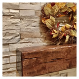 A living room fireplace was refaced with new stacking stone material. A custom wood beam mantle was made to complete the fireplace. |